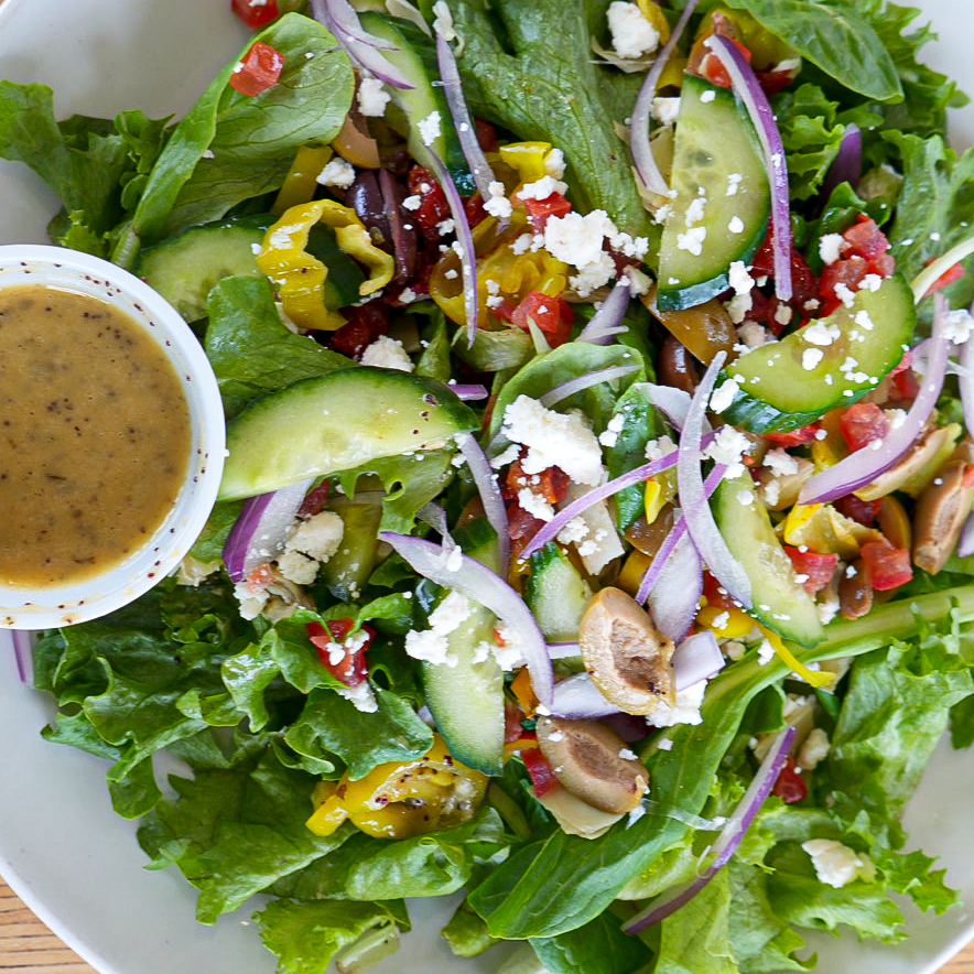 Romaine mix, artichoke, sundried tomato, olive medley, pepperoncini, feta cheese, fresh cucumber, fresh tomato, and tangy Greek dressing. **contains dairy** p>